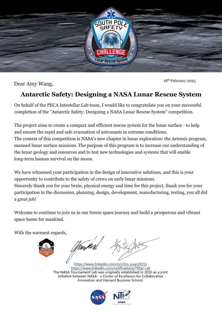 In April 2024, as a member of the youth group, I joined Captain Chris’s Ursa Minor I Interstellar project and participated in the 2024 Space Habitat Solutions Competition of the American Space Association.