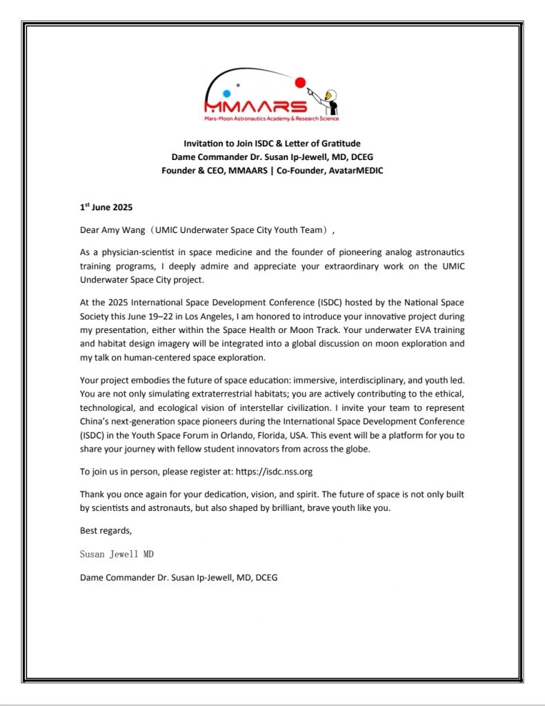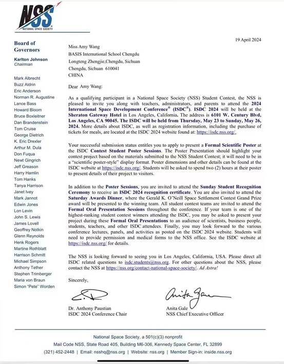In May 2024, our team’s submission “Space City on Pickup Truck-Simulated Space Habitat Solutions” was shortlisted for the competition. As a member of the youth team, I also received an invitation to participate in the NSS Global Space Summit in Los Angeles, USA.