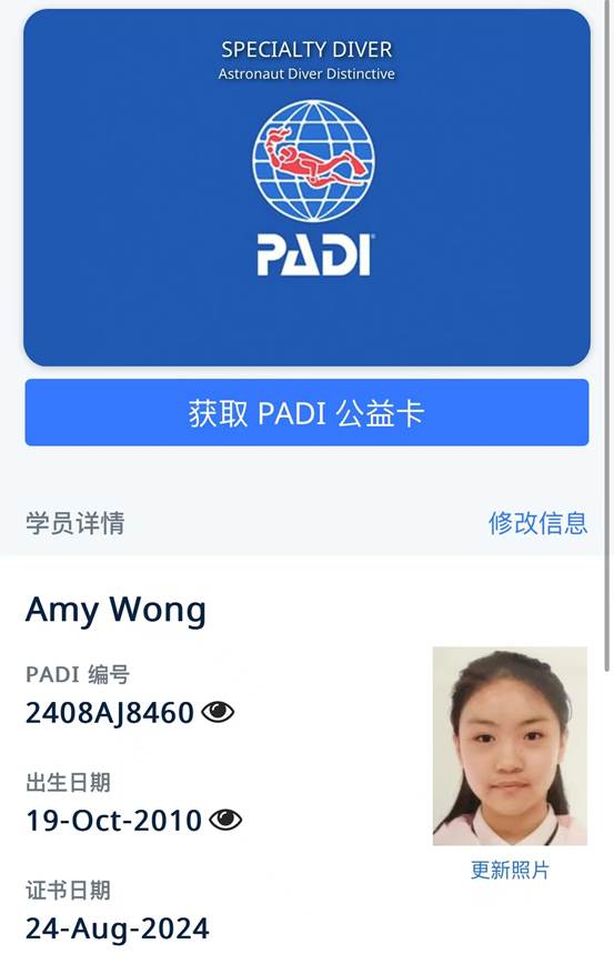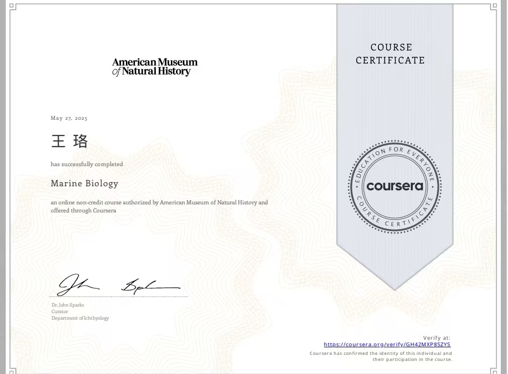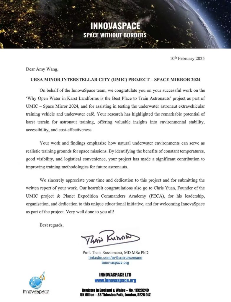 在探索与实践中,我获得了多项专业认证,包括鲸类救援培训证书、青少年潜水证书,、UMIC水下太空训练认证等。我接受过太空模拟训练与海洋生物监测的专业培训。